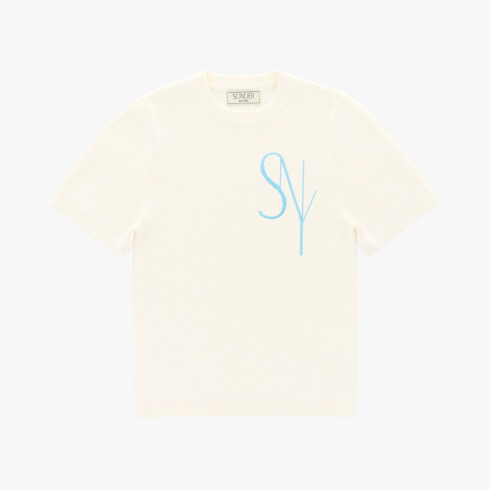 Delivering endless styling potential with this Knit T-shirt embroidered with the label's motif in a gorgeous baby blue. Created from 100% cotton and paired with ribbed finishes and a slim fit.