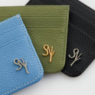 The Motif Cardholder. This cardholder is made from full-grain leather, the motif sits neatly at the bottom right corner, and has four card slots with a center compartment.