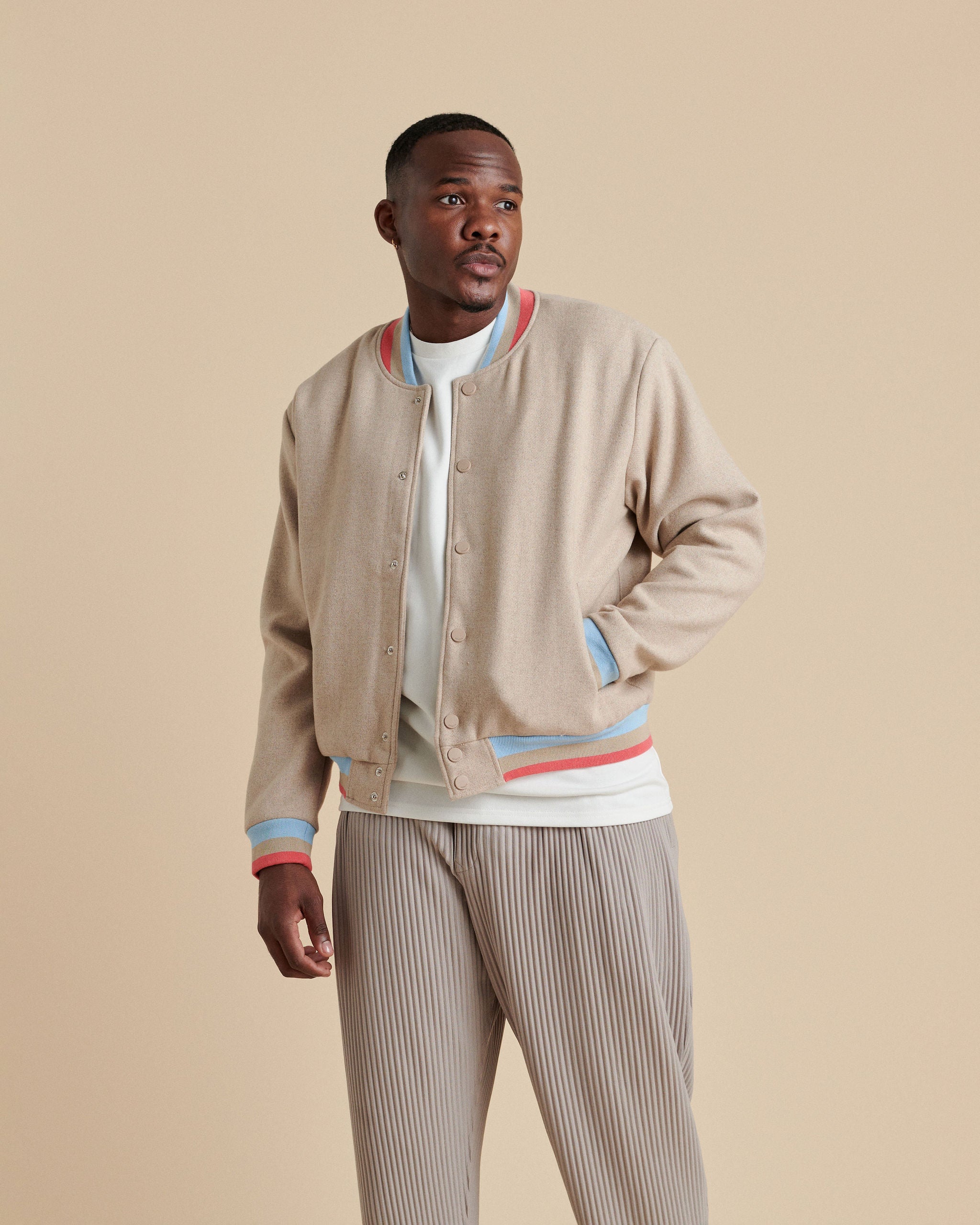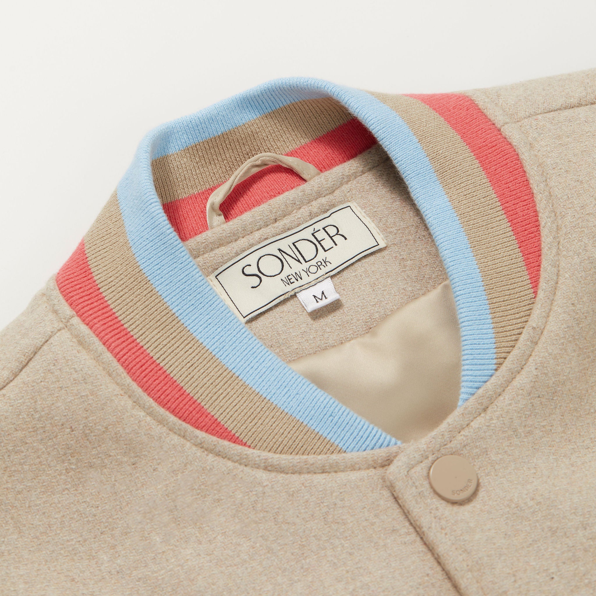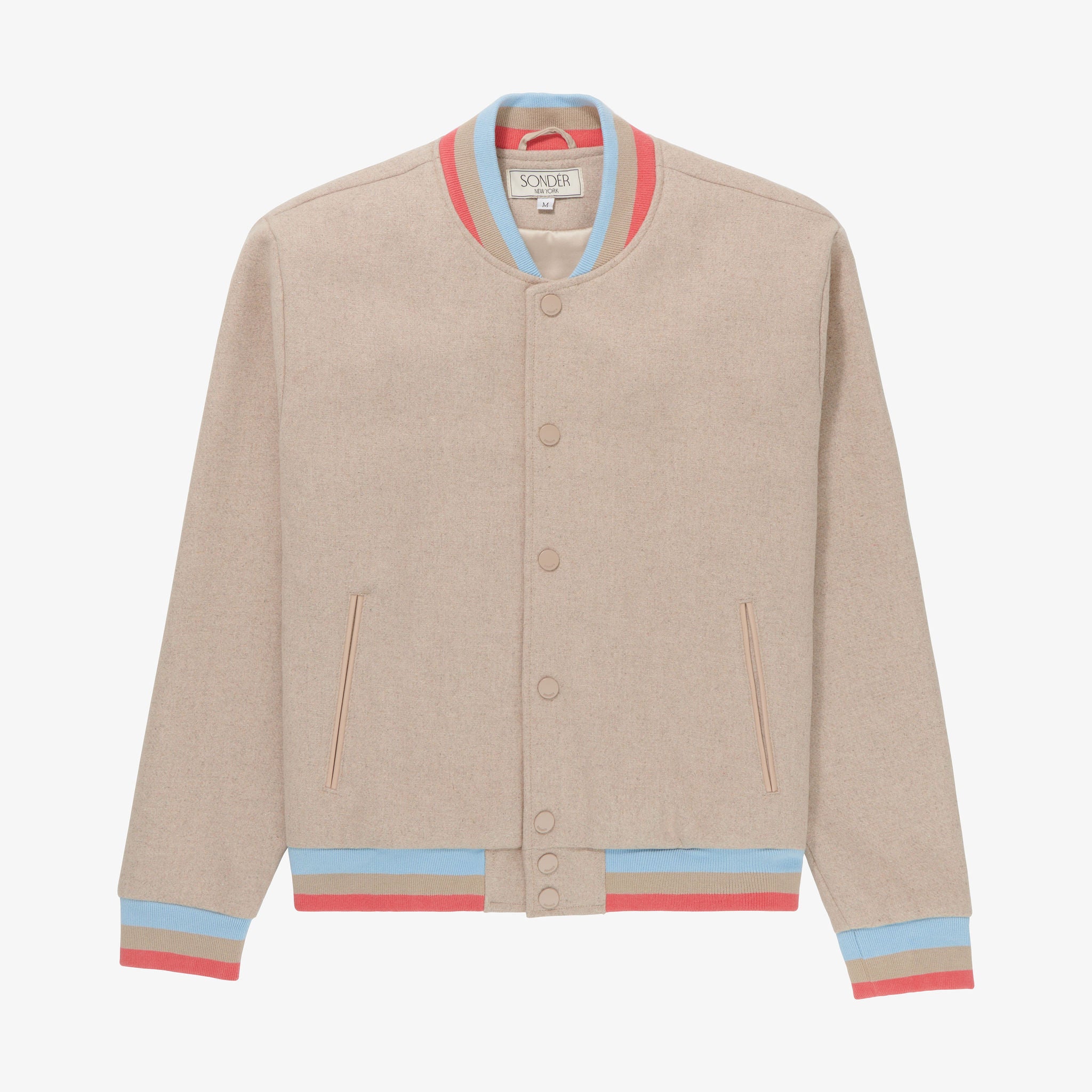 Sondér aims to please in our refined approach to design which is perfectly executed with this bomber jacket. Crafted from a premium wool blend with prominent features — including branded buttons, triple color ribbed collar, cuffs, and hem to add a slight touch to the classic look.